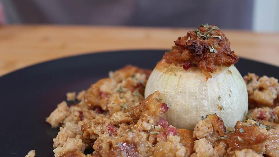 - Sobald die Zwiebeln gar sind, herausnehmen und auf einen Teller geben. Die Füllung um die Zwiebeln verteilen, mit dem Bratensaft übergießen und mit Petersilie garnieren.