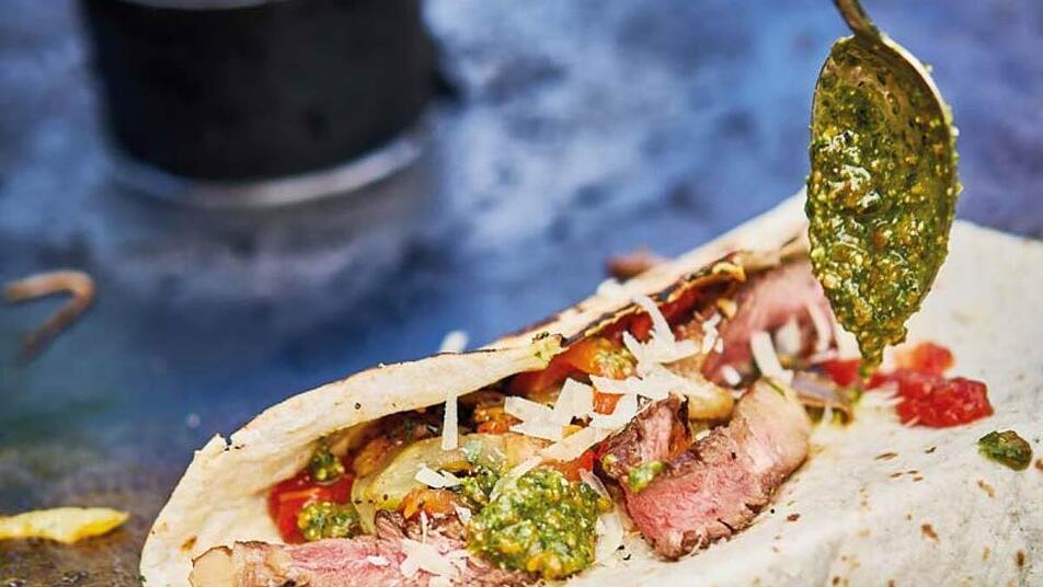 - Die Maisfladen auf der Plancha erwärmen und mit Käse bestreuen, sodass der Käse leicht schmilzt. Dann mit etwas Gemüse und Rinderlendestreifen sowie Salsa und Pesto füllen und zu einem Wrap einrollen.