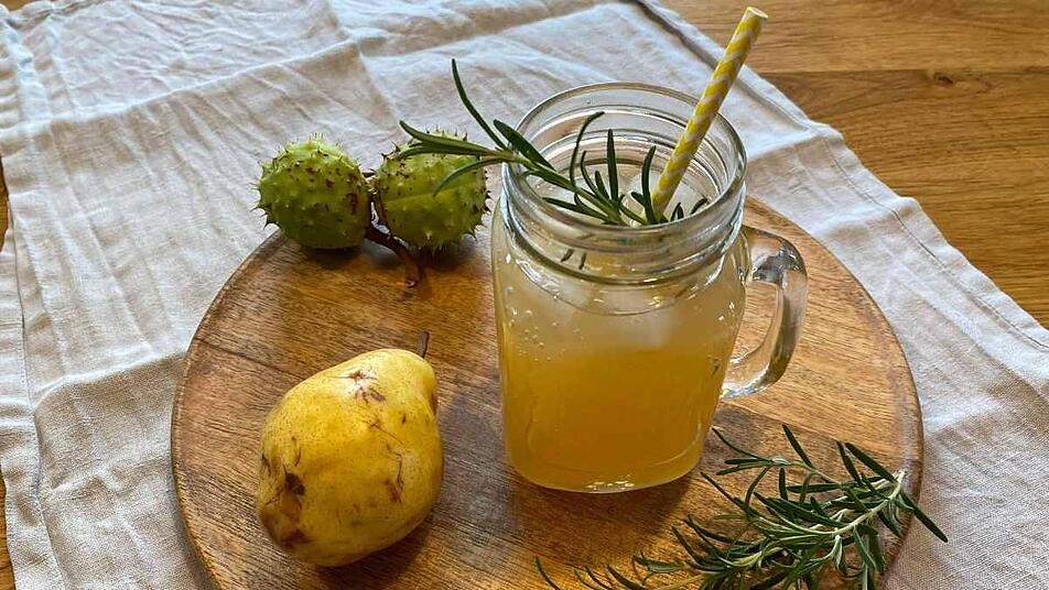 - Die Eiswürfel in ein hohes Glas geben. Den Weißwein hineinschütten, mit Birnensaft auffüllen.