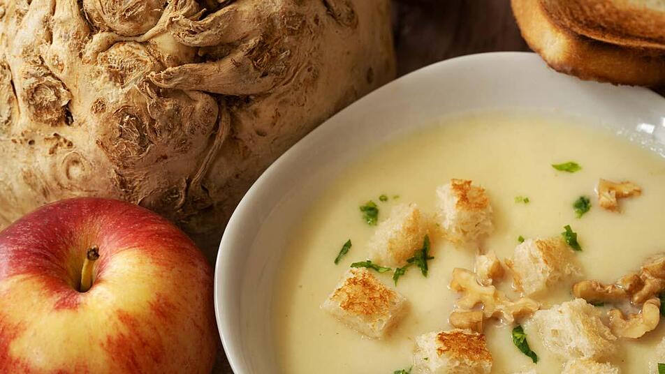 - Sellerie- und Apfelwürfel in den Topf geben und 10 Minuten mitdünsten. Mit Gemüsebrühe auffüllen und 20 Minuten köcheln lassen, bis der Sellerie weich ist.