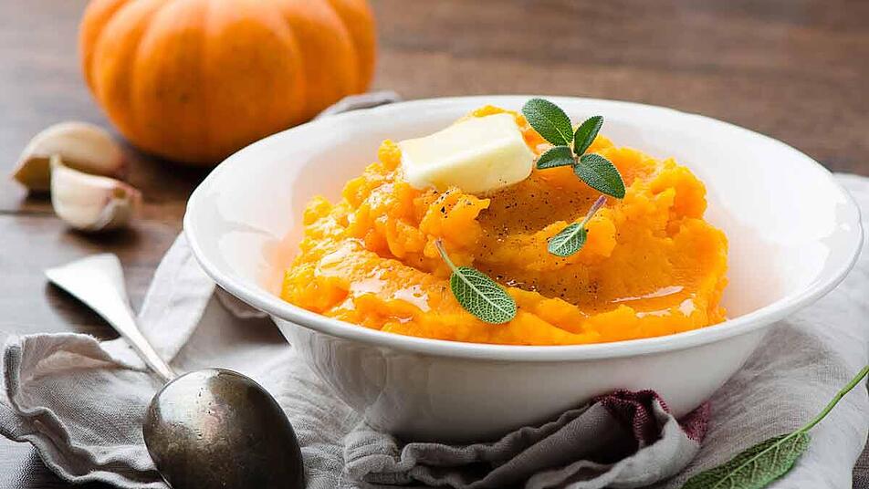 - Mithilfe einer Kartoffelpresse die Kürbis- und Kartoffelstücke fein zerdrücken. Anschließend 1 EL Butter und die gewünschte Menge an Milch hinzufügen.