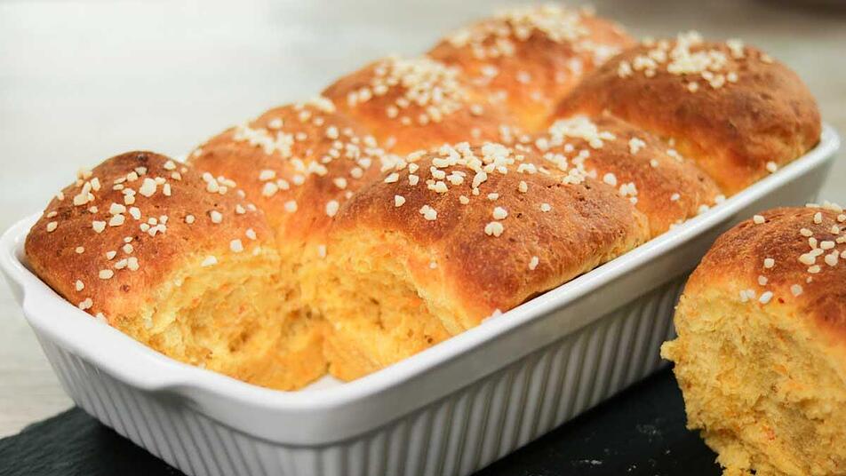 - In der Zwischenzeit die Auflaufform einfetten und den Teig auf einer bemehlten Arbeitsfläche nochmals durchkneten. Eine Rolle formen und in 12 gleichgroße Stücke schneiden. Jedes Stück in eine Kugel formen und in die Form legen. Nochmals für 20 Minuten gehen lassen.