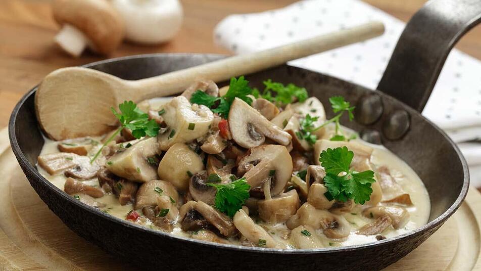- Mit Sahne ablöschen und für circa 10 Minuten einköcheln lassen. Mit Salz und Pfeffer abschmecken und mit frischer Petersilie anrichten.