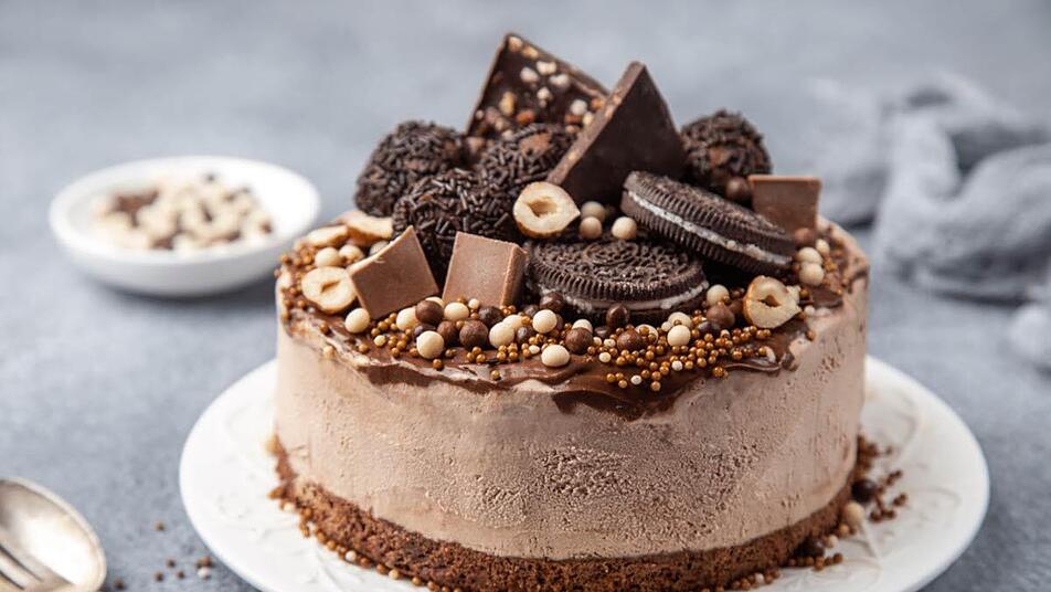 - Die Torte aus dem Gefrierfach nehmen und die Sauce darüber geben. Am besten bereits jetzt die Torte in Stücke schneiden und nur so viel, wie verzehrt wird servieren. Den Rest der Torte wieder einfrieren. Die Eistorte kann beliebig dekoriert werden, z.B. mit Nüssen, weitere Schokolade oder Keksen.