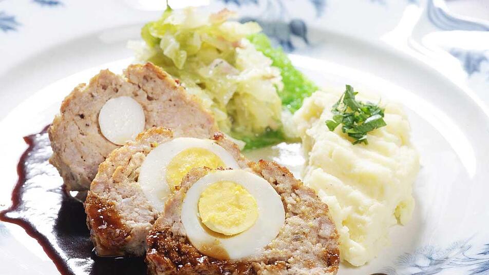 - 3 Eier hart kochen (etwa 10 Minuten). Das alte Brötchen in warmem Wasser einweichen. Die Zwiebel und die Karotte schälen und in feine Würfel schneiden. Den Speck ebenfalls in Würfel schneiden. Den Backofen auf 180 Grad vorheizen (Umluft 160 Grad).