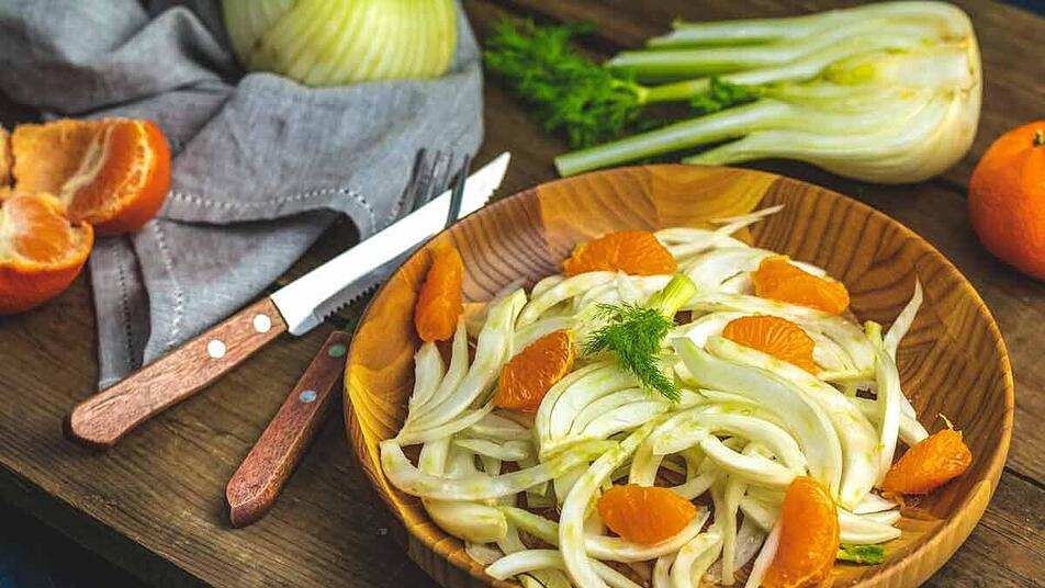 - Zunächst die Fenchelknollen halbieren und in feine Scheiben schneiden. Mandarinen, Apfel und Zwiebel schälen und klein schneiden.