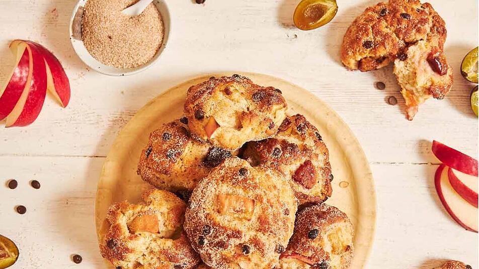 - Die Äpfel dazugeben und unterkneten. 6 - 9 Bälle formen und auf ein Backblech geben. Im vorgeheizten Backofen ca. 25 Minuten backen.