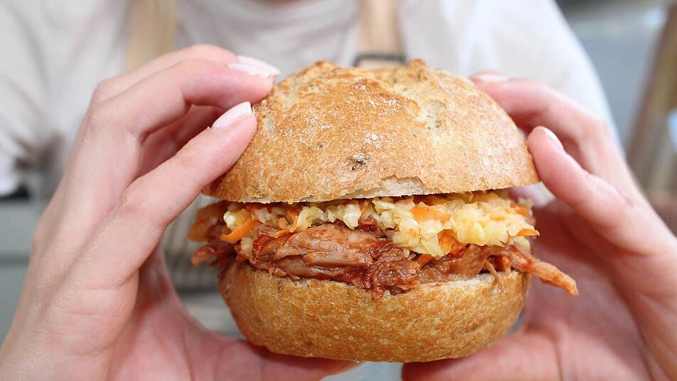 - Die Brötchen vorsichtig aufschneiden und unser Pulled Schäuferla großzügig auf der Unterseite verteilen. Darauf den knackigen Krautsalat!