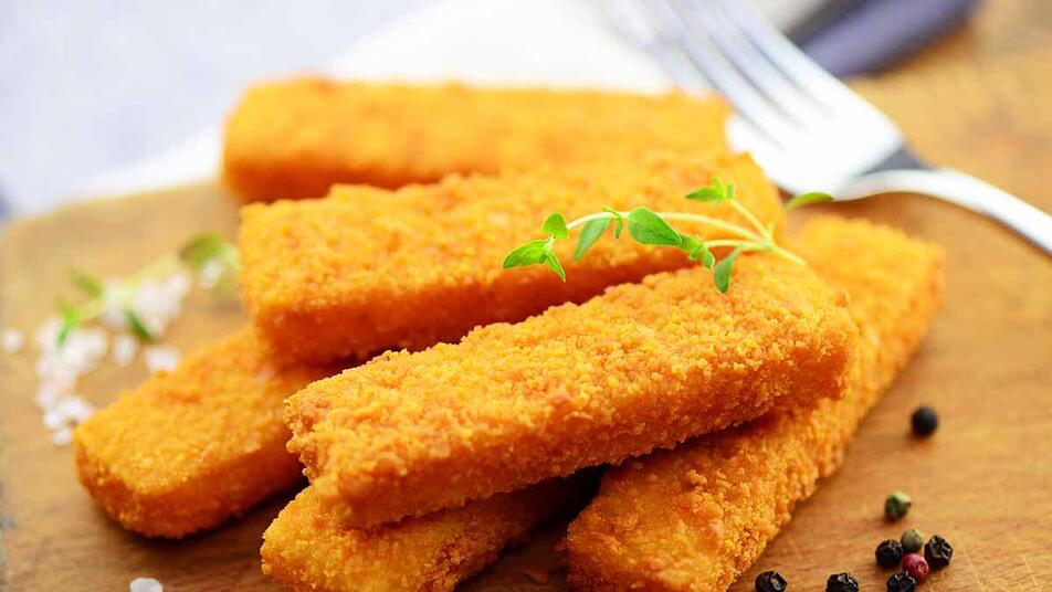 - Die panierten Stäbchen in einer Pfanne mit heißem Fett von beiden Seiten goldgelb anbraten.
