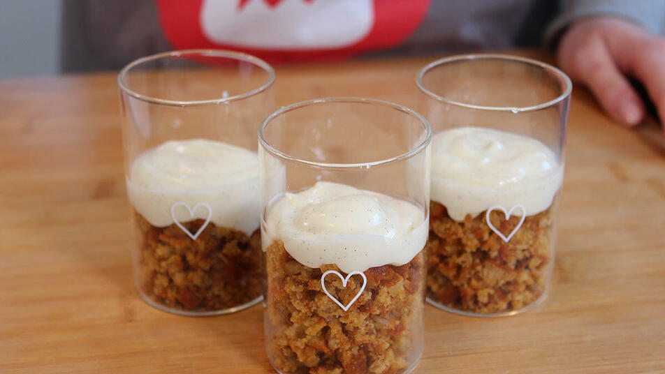 - In die Gläser zuerst die Karottenkuchen-Krümel einfüllen und oben drauf eine Schicht Frischkäse-Frosting. Oder abwechselnd eine Schicht Karottenkuchen-Krümel und eine Schicht Frischkäse-Frosting einfüllen, bis die Gläser gefüllt sind. Die oberste Schicht sollte allerdings das Frischkäse-Frosting sein.