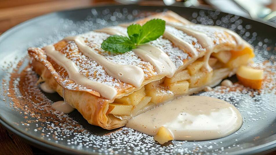 - Den Apfelstrudel etwas abkühlen lassen, in Stücke schneiden und mit Puderzucker bestäuben. Mit warmer Vanillesauce servieren.