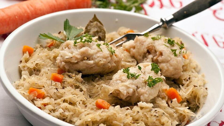 - In einem Top die Gemüsebrühe zum sieden bringen und Krautstreifen und Gelbe Rüben kochen, bis sie gar sind.
