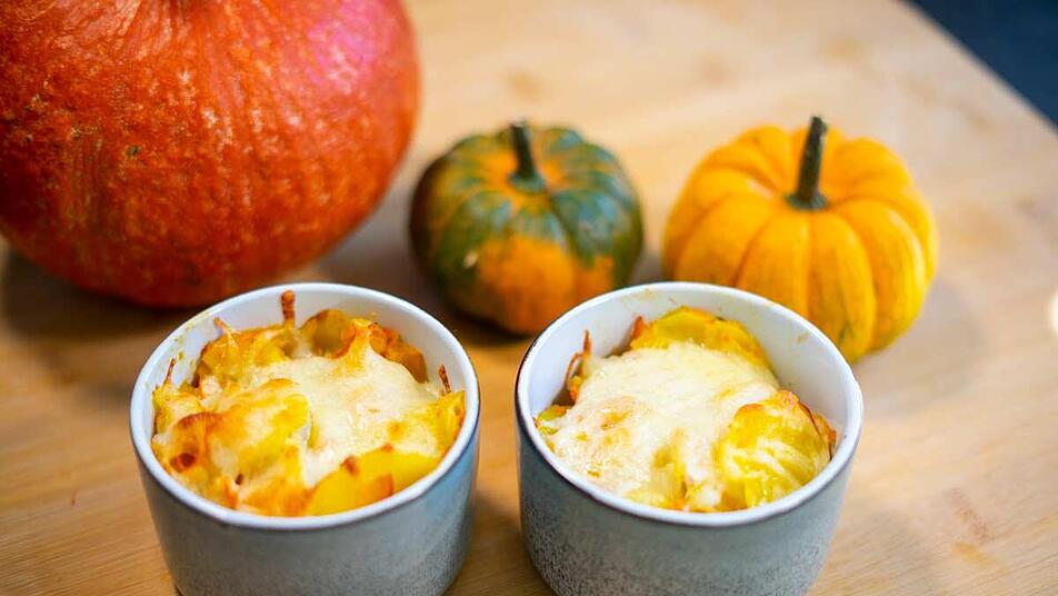 - In einer Pfanne die Zwiebel und den Knoblauch in Öl andünsten. Anschließend die Kartoffeln und den Kürbis mit hinzugeben und ebenfalls mit dünsten. Ungefähr die Hälfte der Semmelbrösel-Käse-Mischung dazugeben. Mit Gemüsebrühe und der Sahne ablöschen und 5 Minuten abgedeckt köcheln lassen. Währenddessen außerdem den Backofen auf 180 Grad Umluft vorheizen.