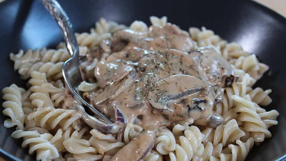 - 1 TL Mehl zu den Pilzen geben und kurz anschwitzen. 150 ml Gemüsebrühe und 100 g Crème fraîche hinzufügen, aufkochen lassen und bei mittlerer Hitze 6-8 Minuten kochen lassen. Dann mit Muskatnuss und Pilzgewürz würzen und mit Thymianblättchen bestreut servieren.