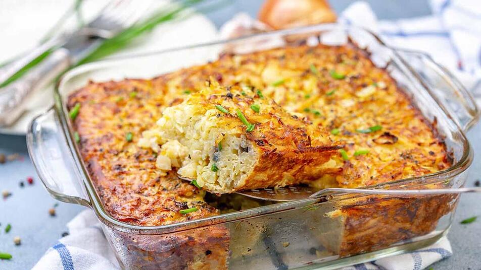 - Sind die Kartoffeln goldbraun, kannst du das Blech aus dem Ofen nehmen. Bevor du die Kartoffelkugel servierst, sollte das Ganze leicht abgekühlt sein.