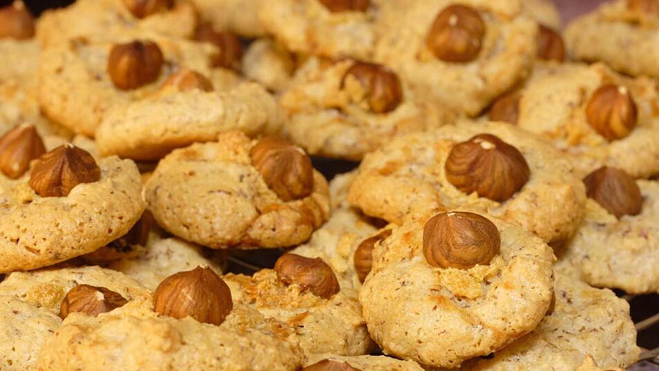 - Nach der Ruhezeit werden kleine Stücke von den Rollen abgeschnitten und leicht rund geformt. Die Teigstücke werden mit verquirltem Ei bestrichen und jeweils mit einer ganzen Nuss – zum Beispiel Haselnuss oder Walnuss – verziert.
