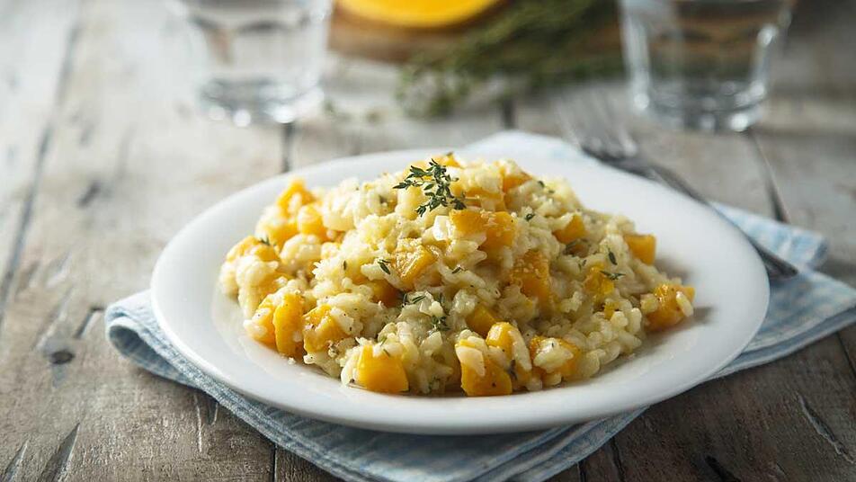 - Das Öl erhitzen und die Zwiebel darin andünsten. Kürbis, Knoblauch und Butter hinzugeben. Den Reis einstreuen und ebenfalls kurz dünsten.