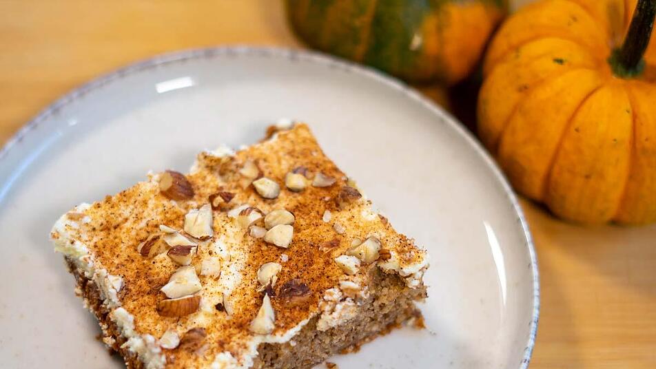 - In der Zwischenzeit: Die Nüsse grob hacken und die Sahne schlagen. Sobald der Kuchen abgekühlt ist, kann die Sahne auf dem Kuchen verteilt werden. Zum Schluss noch mit Zimt und den Nüssen bestreuen. Servieren und schmecken lassen.