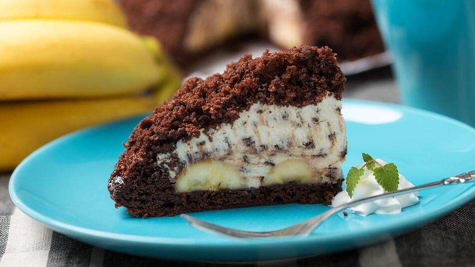 - Für die Füllung: halbiere die Bananen der Länge nach und lege sie mit der Schnittkante nach unten auf den Boden. Schlage dann die Sahne mit dem Sahnesteif und dem Vanillezucker steif und hebe vorsichtig die Schokoraspel unter. Bestreiche den Kuchen mit der Creme, sodass in der Mitte ein (Maulwurf)hügel aus Sahne entsteht.