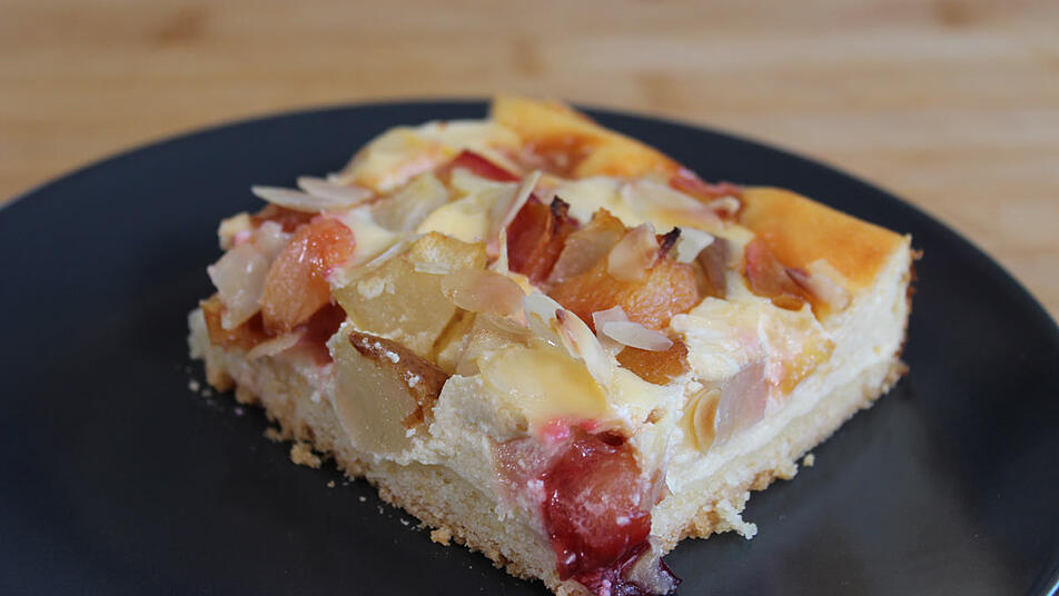 Die geschnittenen Früchte gleichmäßig auf der Quarkmasse verteilen und den Kuchen mit gehobelten Mandeln bestreuen. Das Blech in den vorgeheizten Ofen schieben und den Kuchen etwa 1 Stunde backen. Um sicherzugehen, dass der Kuchen fertig ist, empfiehlt sich die Stäbchenprobe: Ein Holzstäbchen in die Mitte des Kuchens stecken – bleibt kein Teig haften, ist der Kuchen fertig.