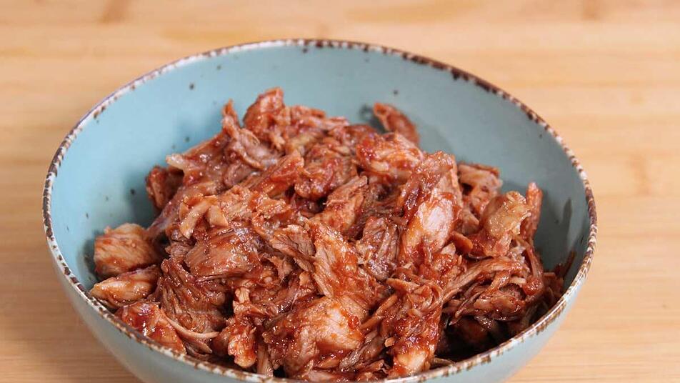 - Das Fleisch mithilfe von Gabeln in kleine Stücke zerpflücken. Besonders gut gelingt das mit sogenannten Fleischkrallen, diese sind aber nicht zwingend notwendig!