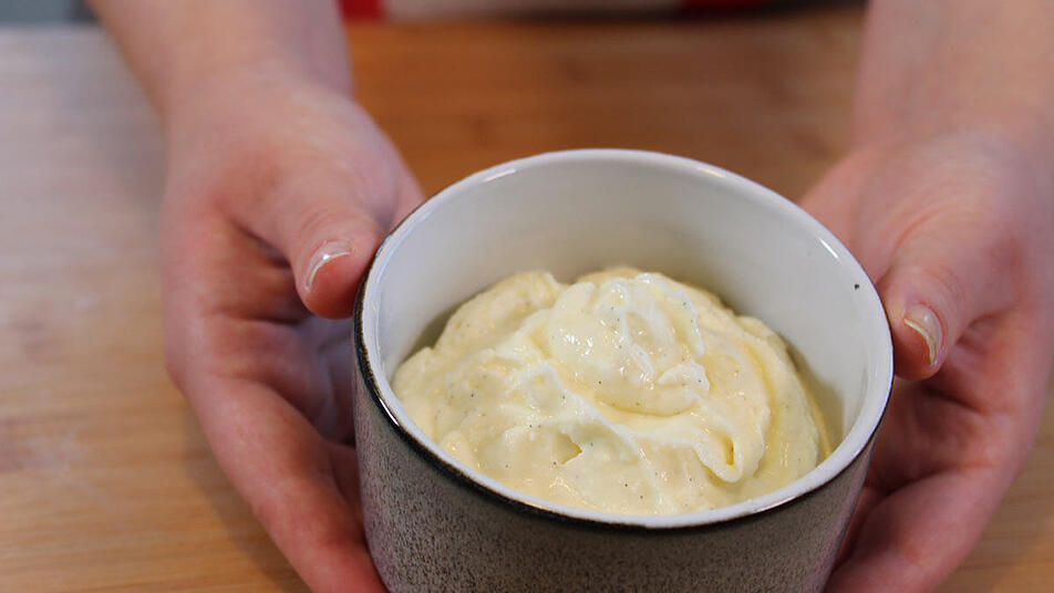 - Frischkäse, Vanillepaste und Puderzucker in eine Schüssel geben und gut miteinander vermischen bis eine glatte Masse entsteht.