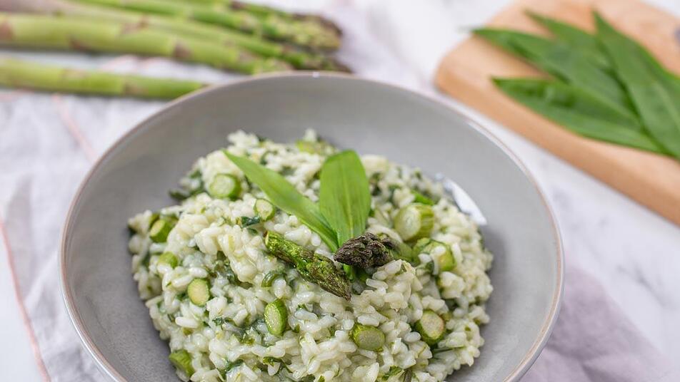 - Nach etwa 10 Minuten die Spargelstücke zum Risotto geben und weiter köcheln lassen, bis der Reis gar und cremig ist (insgesamt etwa 18-20 Minuten).