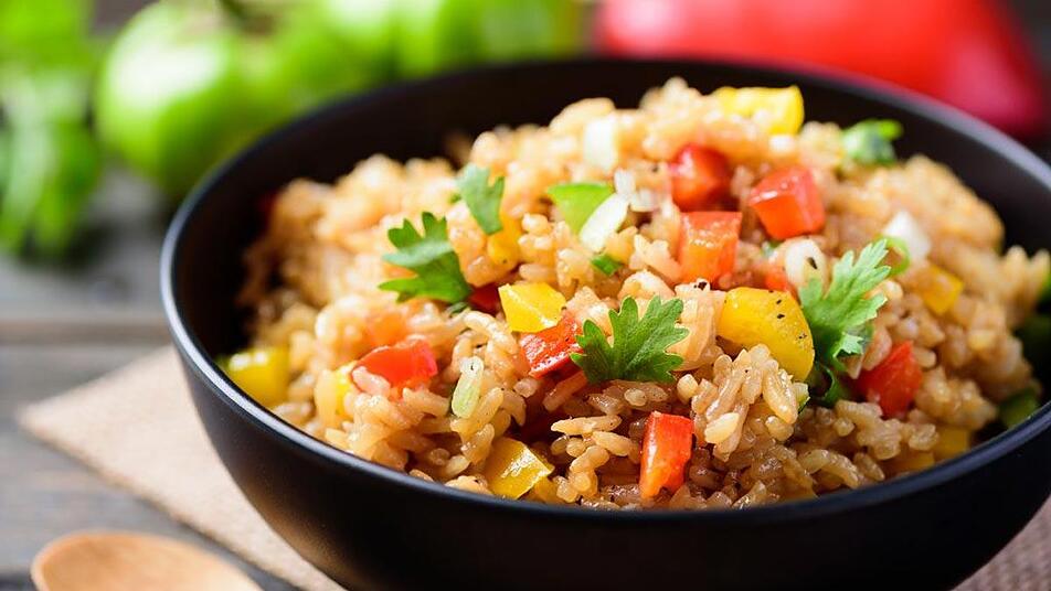 - Danach in der Pfanne 1 EL Öl erhitzen und den gegarten Reis kurz anbraten. Währenddessen in einer Schüssel die Eier mit 2 EL Sojasauce verrühren und dann über den Reis in die Pfanne gießen. Unter ständigem Rühren die Eier mit dem Reis Vermengen und ca. 5 Minuten anbraten. Schließlich das Gemüse mit in die Pfanne geben, alles vermengen und nochmals abschmecken.