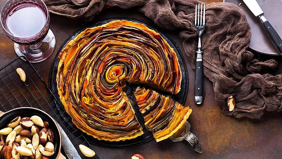 - Die Füllung vorsichtig über die Gemüse-Rose gießen, bis die Form gefüllt ist. Die Quiche bei 200 Grad Umluft in den vorgeheizten Backofen schieben und für 30 Minuten backen.