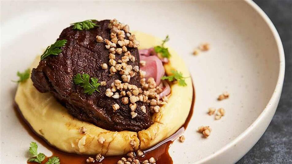 - Den Steinpilzschaum auf einen Teller geben. Die Bäckchen darauf anrichten und mit dem Schmorfond überziehen. Zu den geschmorten Kalbsbäcken passen Kartoffellbrei oder Serviettenklöße hervorragend.