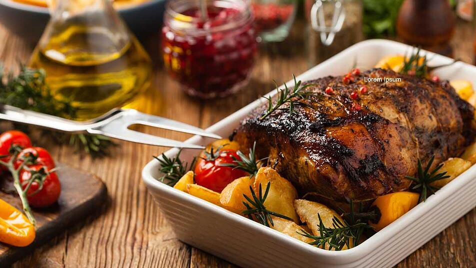 - Nach ungefähr 2 Stunden aus dem Fond nehmen und abtropfen lassen. Anschließend auf einer Platte servieren und anschneiden.