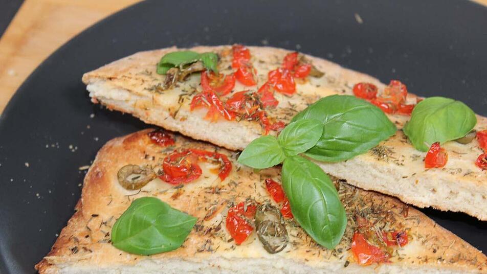 - In der Zwischenzeit bereiten wir die Zutaten für den Belag vor, in dem wir sie waschen und klein schneiden. Anschließend den Belag gleichmäßig verteilen und einen Esslöffel Olivenöl über die rohe Focaccia träufeln.