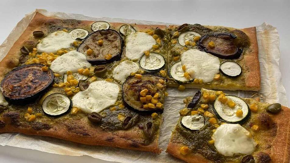 - Anschließend die Zucchini in Scheiben schneiden und auf die Pizza legen. Danach die gebratenen Auberginenscheiben dazugeben, den Mozzarella abtropfen lassen, schneiden und auf die Pizza geben. Den Mais und die Oliven ebenfalls darauf verteilen.