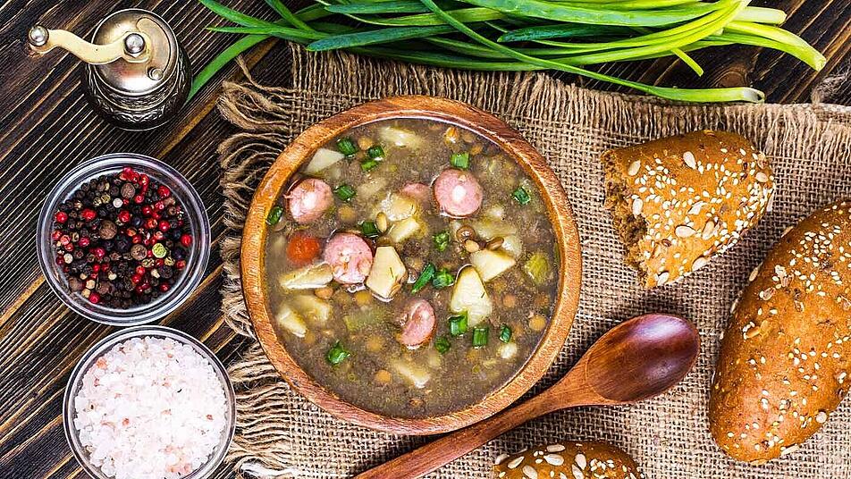 - Kartoffeln schälen und in kleine Stücke schneiden. Die restliche Gemüsebrühe und Senfkörner aufkochen, Kartoffeln hinzugeben und 15 Minuten weiterköcheln lassen. Beide Brühen miteinander vermengen, die Bratwürste hineingeben und den Eintopf 10 Minuten ziehen lassen.