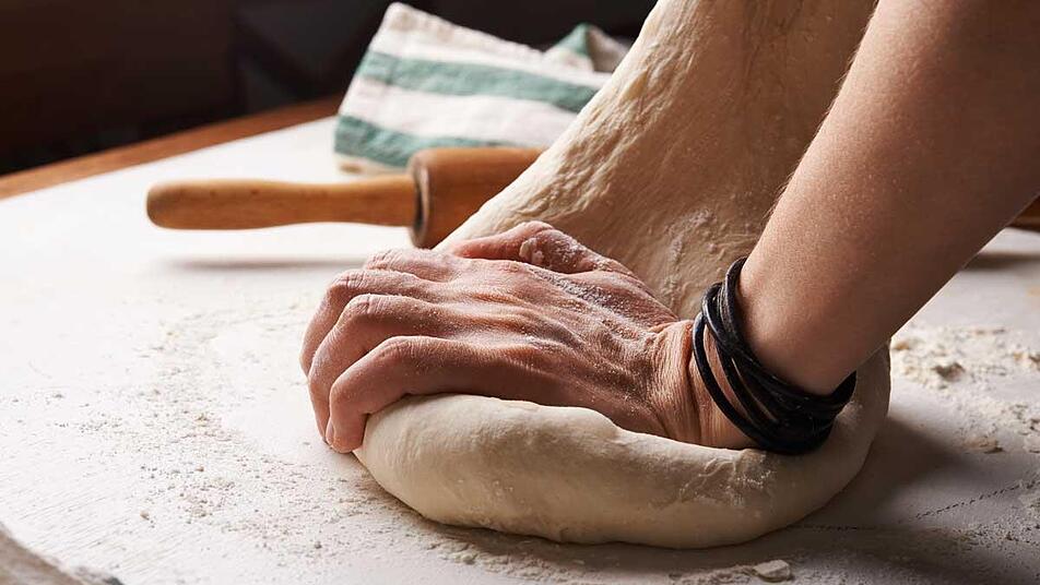 - Nun sollte der Teig sein Volumen verdoppelt haben. Zur Weiterverarbeitung den Teig auf einer bemehlten Oberfläche in gewünschter Form und Größe ausrollen, nach Belieben belegen und bei etwa 180 Grad für 10-12 Minuten backen.