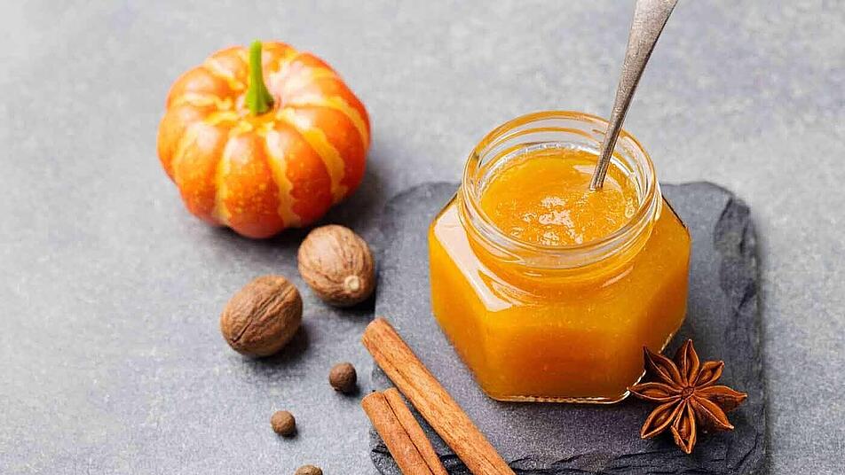 - Den Kürbis schälen und in kleine Stücke schneiden. Die Schalen der Zitronen und der Orangen fein abreiben und Saft herauspressen. Die Stücke mit dem Saft und der abgeriebenen Schale, dem Likör, und dem ausgekratzten Vanillemark in einen Topf geben.