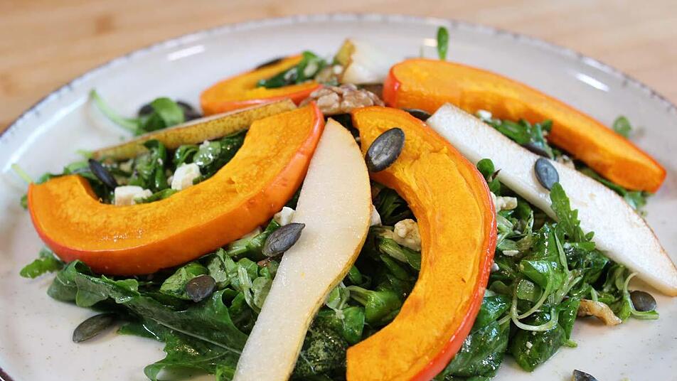 - Anschließend haben wir den Salat auf einem großen Teller angerichtet und mit den Birnen-Scheiben sowie dem gebackenen Kürbis garniert.