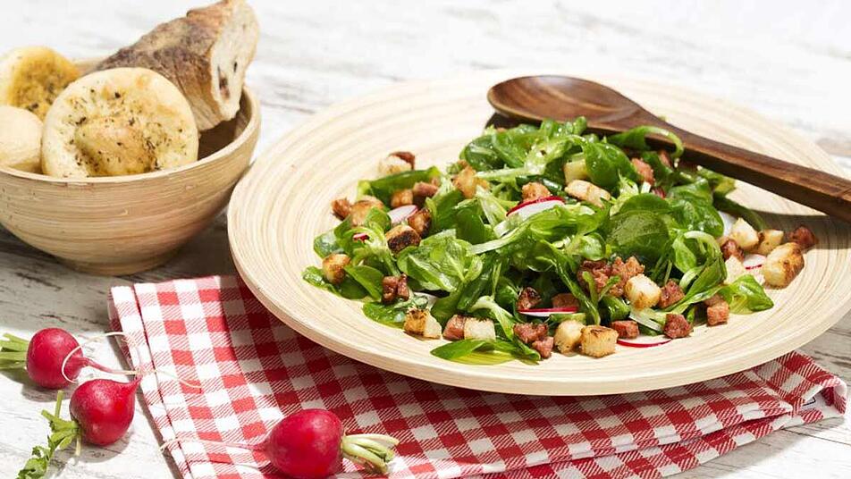 - In eine große Salatschüssel zunächst den Feldsalat, die Tomaten und die Radieschen geben. Dann die Kartoffelwürfel, die Speckstücke und den Käse darauf verteilen.