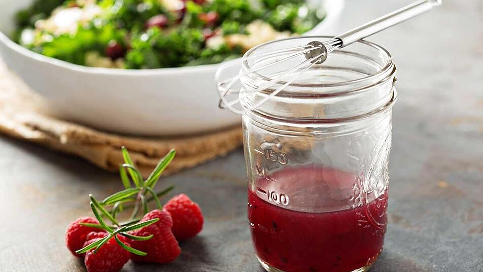 - Mit einer Gabel gut zerdrücken und durch einen feinen Sieb passieren, dabei das Himbeermark auffangen. Nun Öl, Essig und Senf hinzugeben und mit Salz & Pfeffer abschmecken.