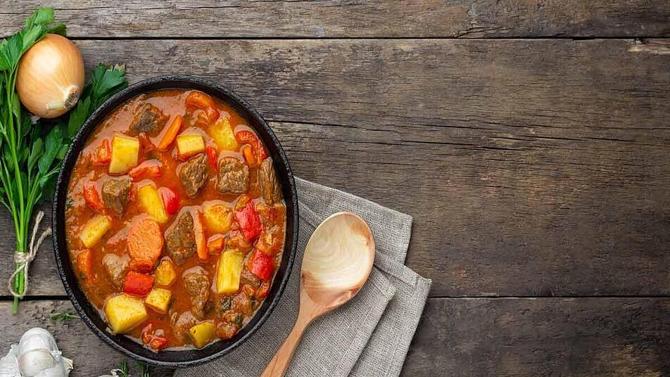 - Das Suppenfleisch waschen, trocken tupfen und in 2x2 cm große Würfel schneiden. Wasser in einen Topf geben, aufkochen lassen und das Fleisch mit den Brühwürfeln garen. Es sollte noch nicht weich sein.