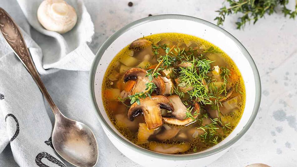 - Pilze, Kartoffeln, Sellerie und Karotte putzen und in Scheiben schneiden. Das Gemüse mit Kümmel, Majoran, Lorbeerblättern und dem Pulver für Gemüsebrühe in 1,5 l Wasser zum Kochen bringen. So lange köcheln lassen, bis die Kartoffeln weich sind.