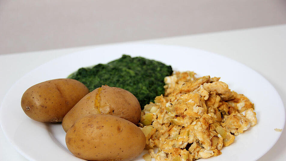 - Kartoffeln, Spinat und Rührei auf einem Teller anrichten und servieren.