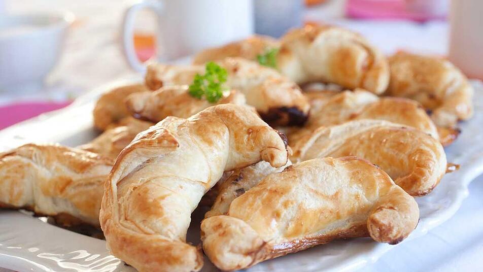- Jetzt den Schinken mittig auf den ausgerollten Teig geben und den Teig ringsherum mit etwas Wasser bepinseln. Die langen Seiten über den Schinken schlagen und die kurzen Seiten ebenfalls mit Wasser einstrechen und dann an den Schinken drücken.