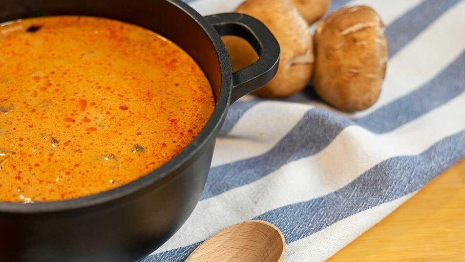 - Alles mit der Brühe ablöschen. Die Sahne sowie den Pilzfond ebenfalls dazu gießen und die Soße einmal aufkochen lassen.