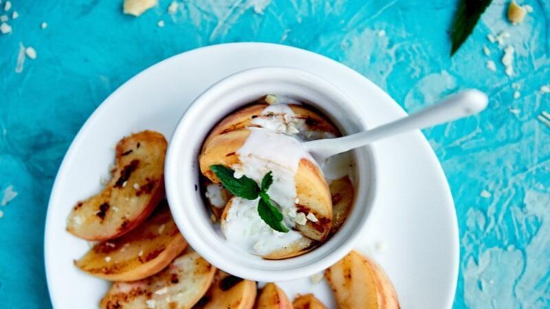 - Rapsöl auf eine heiße Grillplatte/Grillpfanne geben. Die Pfirsichspalten hinein geben und goldbraun anrösten.