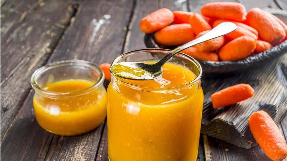 - Jetzt die gekochten Karotten in ein Sieb geben, gut abtropfen lassen und pürieren. Dann den Zucker, Honig und den Zitronensaft zusammen mit dem Abrieb in den Topf geben und ebenfalls für 5 Minuten leicht köcheln lassen.
