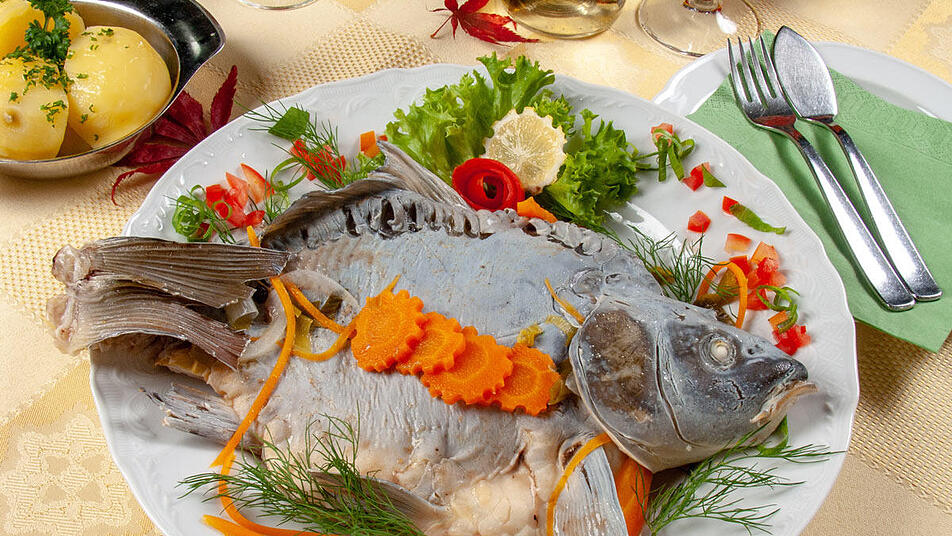 - Den Karpfen vorsichtig in das kochende Wasser geben. Topf sofort abdecken, kurz aufkochen und den Karpfen ca. 30-35 Minuten ziehen lassen. Der Fisch ist gar, wenn sich die Rückenflosse leicht herausziehen lässt.