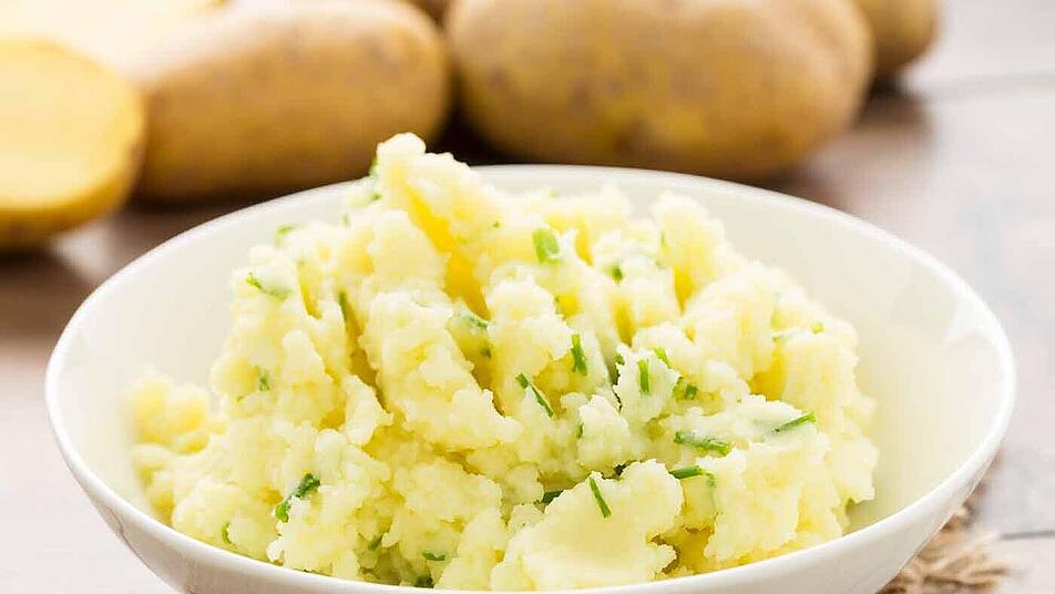 - Schnittlauch waschen und in Röllchen schneiden. Unter den Kartoffelstampf mengen. Mit Salz und Muskat abschmecken und mit den restlichen Butterflocken garnieren.