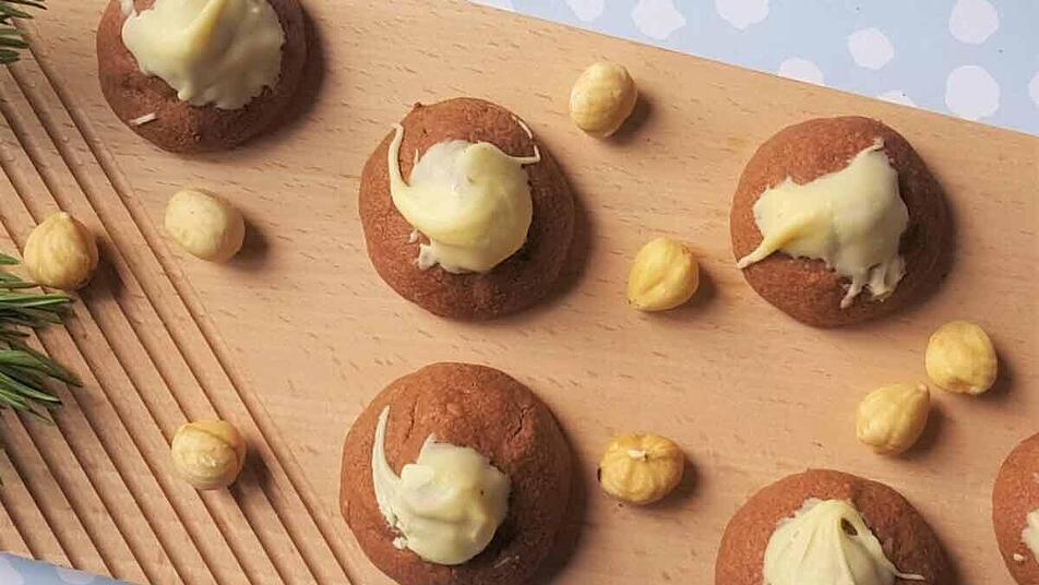 - Die Teigrolle danach in 30 Scheiben (1 cm dick) schneiden. Jede Scheibe auf die Arbeitsfläche legen und 1 Haselnuss darauflegen. Dann die Seiten rundum hochklappen und einen kleinen Berg formen. Die Berge auf einen mit Folie oder Papier belegten Teller setzen und 10 Minuten ins Tiefkühlfach stellen.