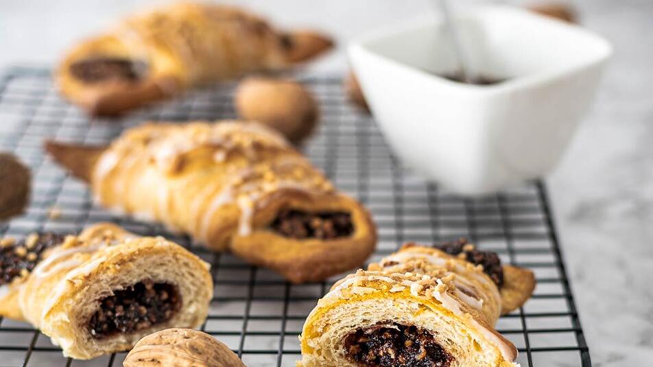- Lege die Haselnuss-Croissants mit etwas Abstand zueinander auf ein mit Backpapier ausgekleidetes Backblech und backe sie im 180°C vorgeheizten Backofen (Ober-/Unterhitze) etwa 20 Minuten goldbraun.